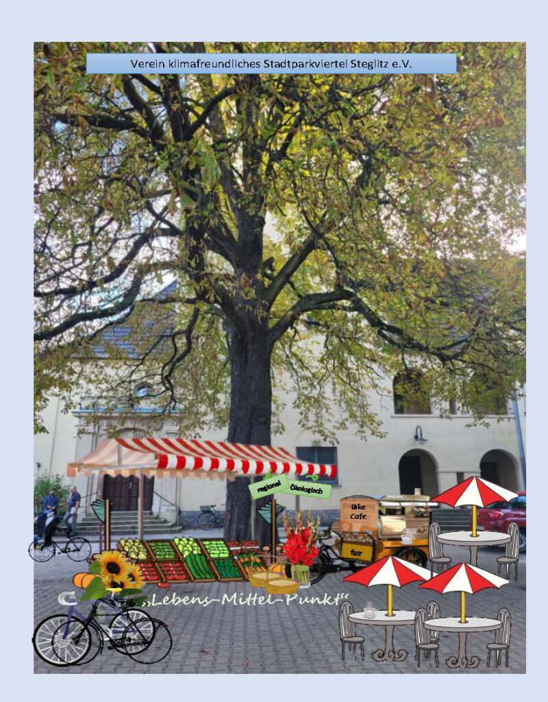 Als Verein Klimafreundliches Stadtparkviertel Steglitz e.V. organisieren wir in Kooperation mit dem Nachbarschaftshaus Markus und der Gemeinde der Markuskirche in der Sommersaison an mehreren Freitagen von 14:30 bis etwa 18:30 Uhr unseren ökologischen Wochenmarkt. Der Vorplatz unter der Kastanie der Markuskirche wird dann zum LebensMittelPunkt, das heißt um keinen „gewöhnlichen“ Wochenmarkt: Wir erzielen keinen Gewinn und sind Verteiler:innen, nicht Verkäufer:innen der angebotenen Produkte. Stattdessen laden wir zum Verweilen, Plaudern und Engagieren ein!